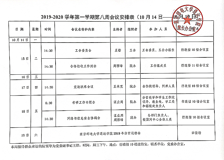 2019-2020学年第一学期第八周会议安排表