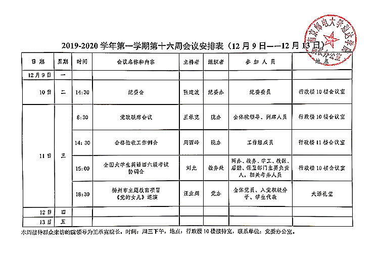 2019-2020学年第一学期第十六周会议安排表