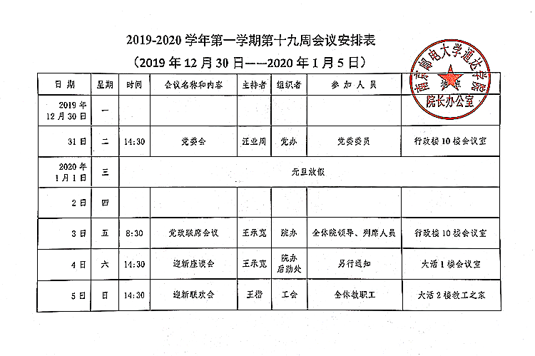 2019-2020学年第一学期第十九周会议安排表