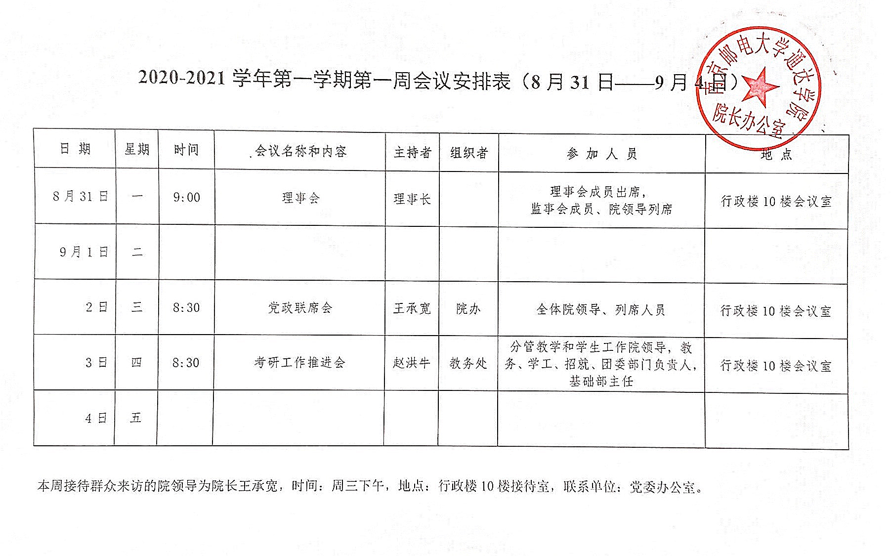 2020-2021学年第一学期第一周会议安排表