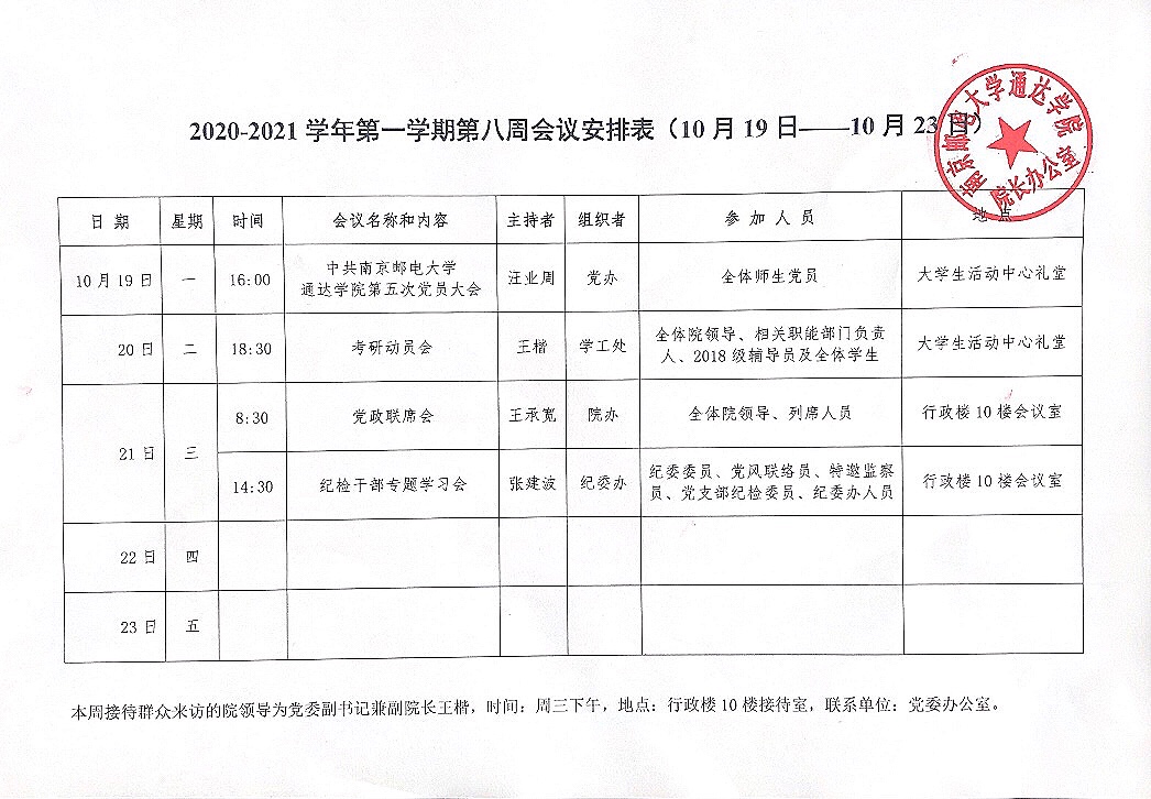 2020-2021学年第一学期第八周会议安排表