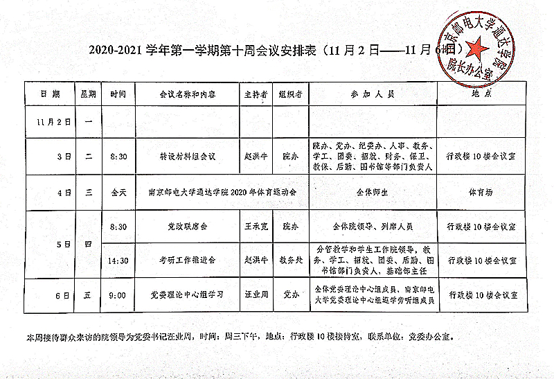 2020-2021学年第一学期第十周会议安排表