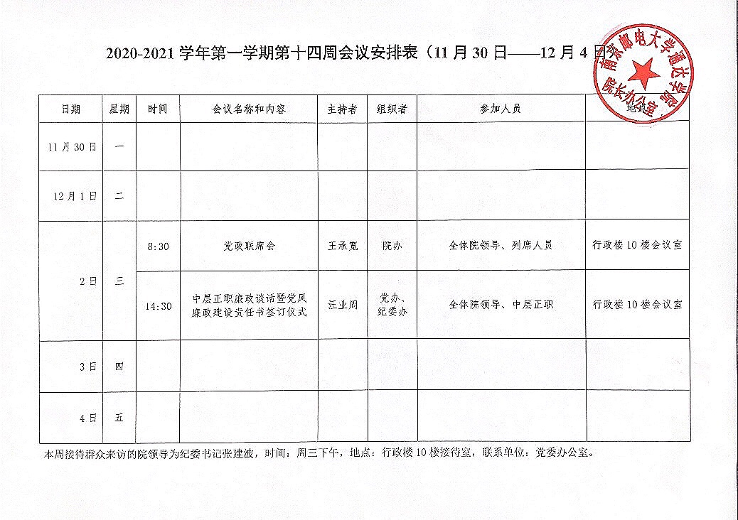 2020-2021学年第一学期第十四周会议安排表