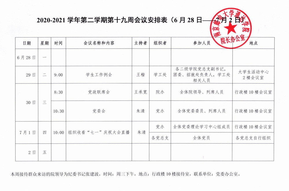 2020-2021学年第二学期第十九周会议安排表