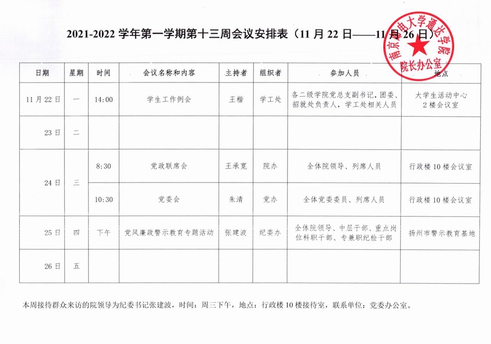 2021-2022学年第一学期第十三周会议安排表