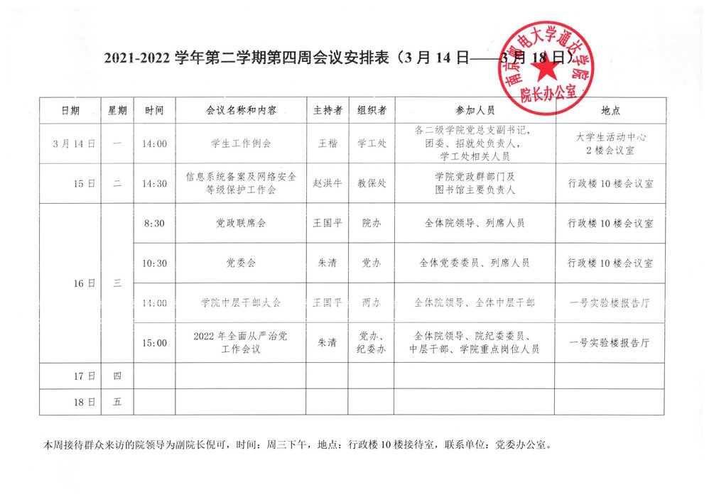 2021-2022学年第二学期第四周会议安排表