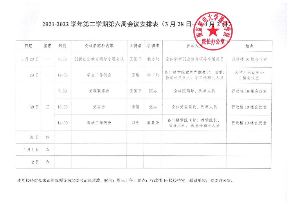 2021-2022学年第二学期第六周会议安排表