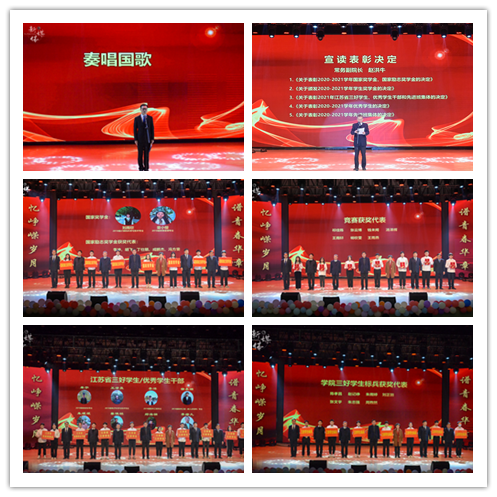 表彰环节由党委副书记、副院长王楷主持。在庄严的国歌声中,表彰大会拉开了序幕。常务副院长赵洪牛宣读了《关于颁发2020-2021学年国家奖学金、国家励志奖学金的决定》《关于颁发2020-2021学年学生奖学金的决定》《关于表彰2021年江苏省三好学生、优秀学生干部和先进班集体的决定》《关于表彰2020-2021学年优秀学生的决定》及《关于表彰2020-2021学年先进班集体的决定》,全体院领导上台为获奖学生颁奖。本学年,kaiyun官网共评出国家奖学金2人、国家励志奖学金165人、江苏省三好学生8人、江苏省优秀学生干部2人、江苏省先进班集体3个、院三好学生标兵64人、三好学生449人、优秀学生干部234人、一等奖学金277人、二等奖学金859人、三等奖学金1213人、技能成才奖111人、社会工作优秀奖299人、第二课堂活动优秀奖26人、学习进步奖1412人、帮扶之星奖394人、院先进班集体17个。王承宽院长、朱清书记为暑期奋斗在校园抗疫一线的青年突击队颁发了“抗疫服务先进集体”奖。