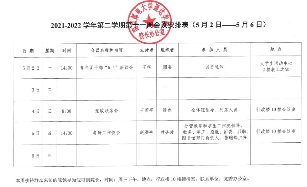 2021-2022学年第二学期第十一周会议安排表