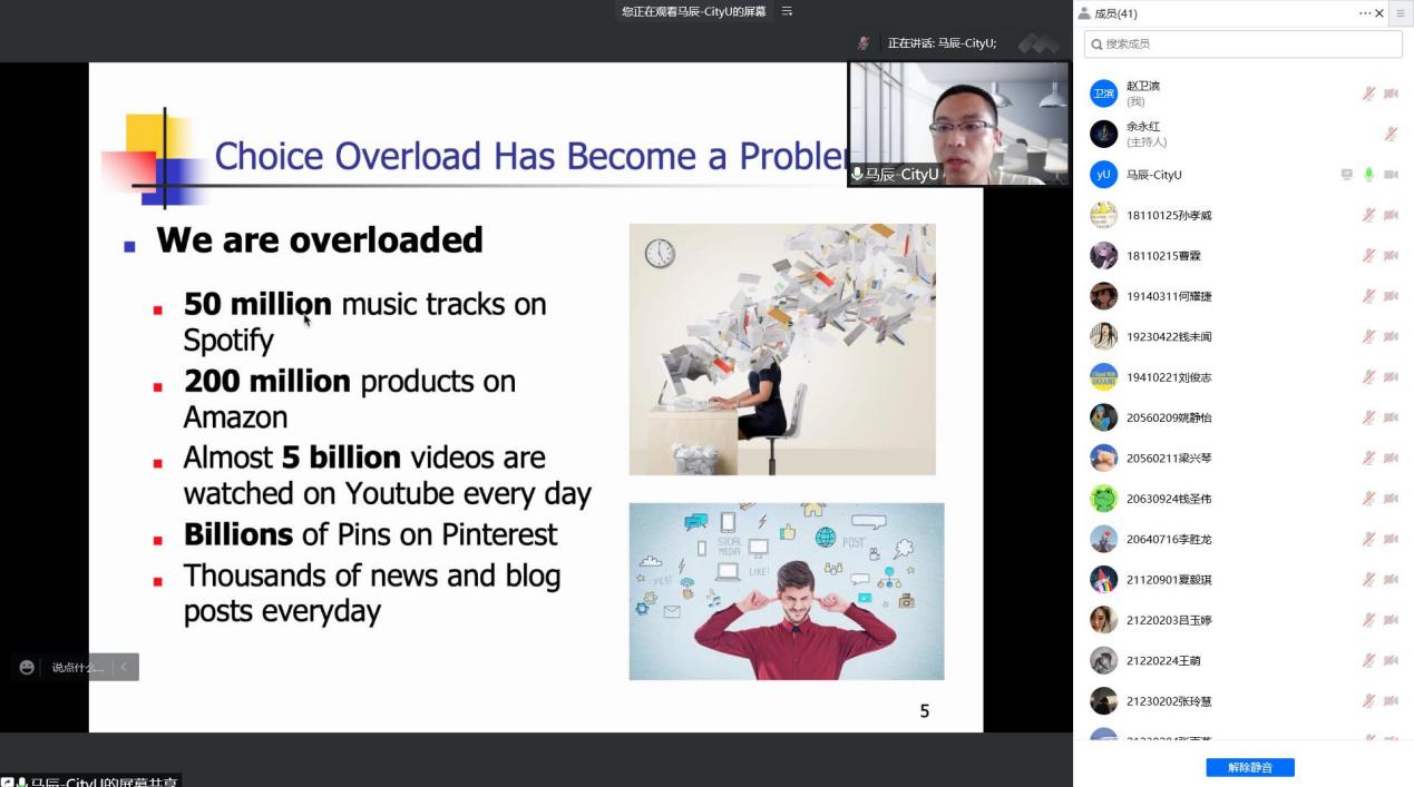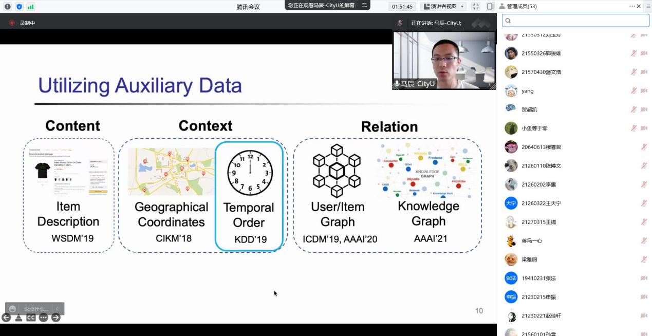 马教授的报告分两部分,第一部分是推荐系统的基本概念和方法,第二部分是个性化推荐模型的前沿进展。在第二部分,针对如何实现更有效的推荐,马教授分享了他的最新研究工作,包括对辅助信息的利用、对个性化超参数的学习,以及这类工作在工业界落地成功的案例。报告最后,马教授对推荐技术的发展趋势进行了展望并回答了师生的提问。整场报告内容饱满、信息量大。马教授的讲解清晰易懂,启迪深刻,受到与会师生的欢迎与好评。