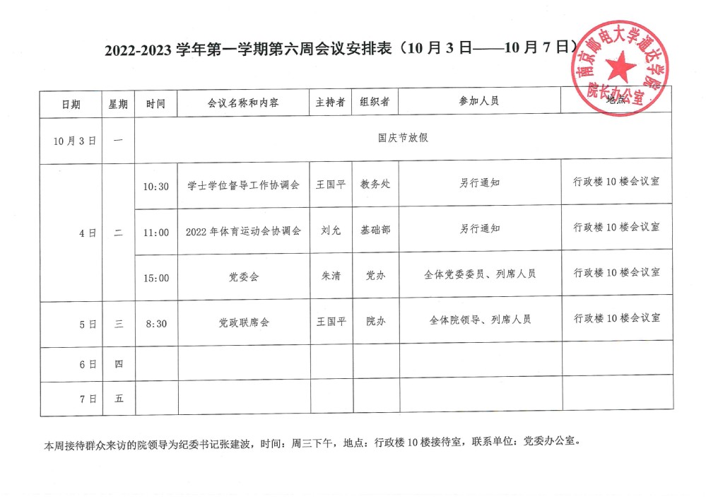 2022-2023学年第一学期第六周会议安排表