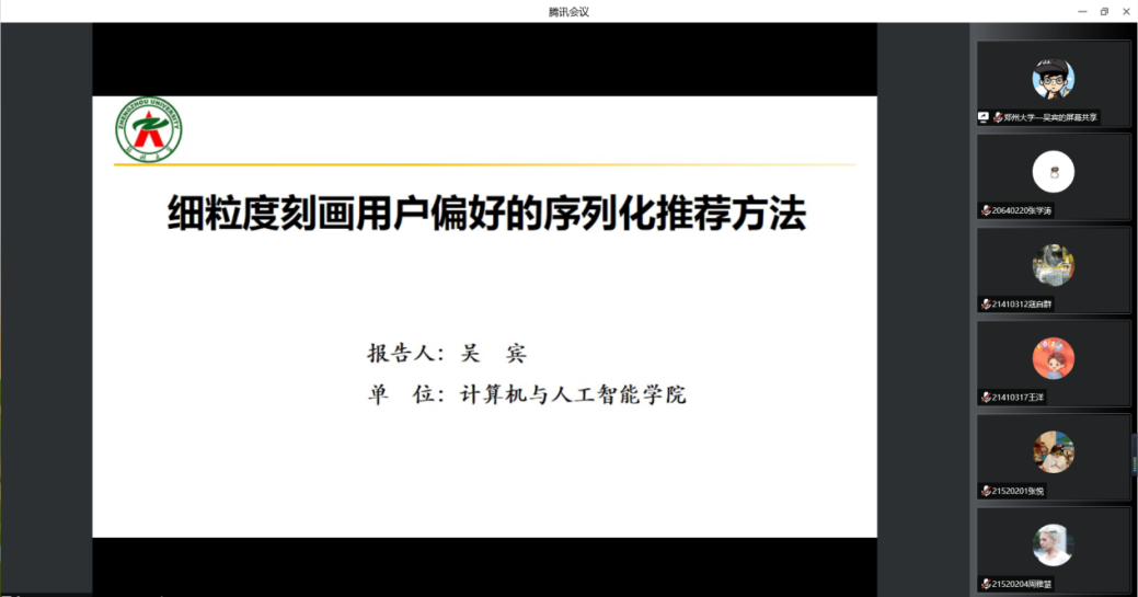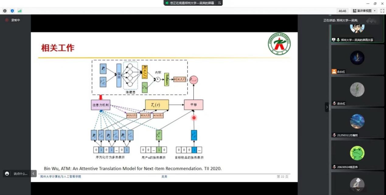 9月28日,由kaiyun官网教务处主办,计算机工程学院承办的“细粒度刻画用户偏好的序列化推荐系统”为主题的学术讲座在线上举行,本次讲座邀请郑州大学副研究员吴宾博士担任主讲。