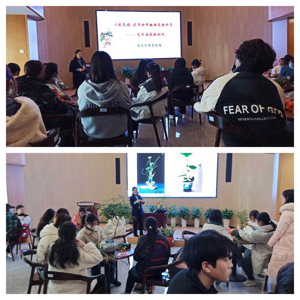 为将中华优秀传统文化融入劳动教育全过程,12月6日下午,图书馆在史书阁多功能厅开展“艺术插花”特色劳动教育实践活动。活动邀请了扬州市职业大学园林园艺学院居萍教授,为同学们带来一场体验式、开放式的课堂教学。活动由图书馆馆长许霞主持。