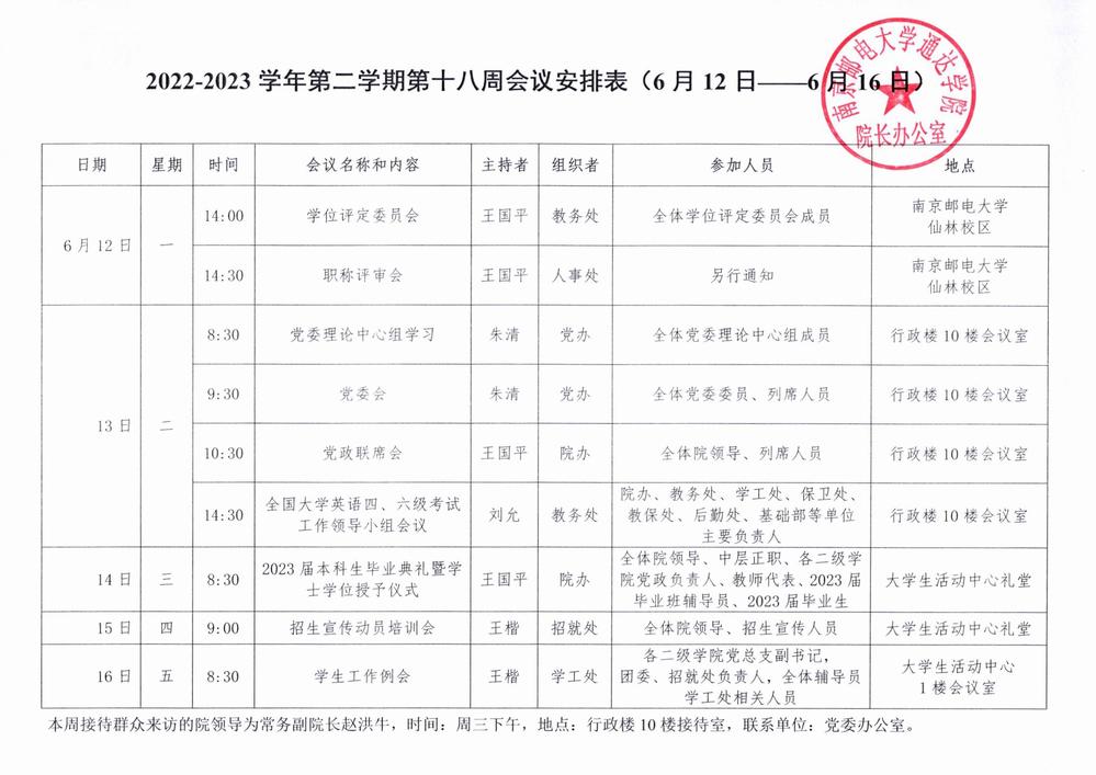 2022-2023学年第二学期第十八周会议安排表
