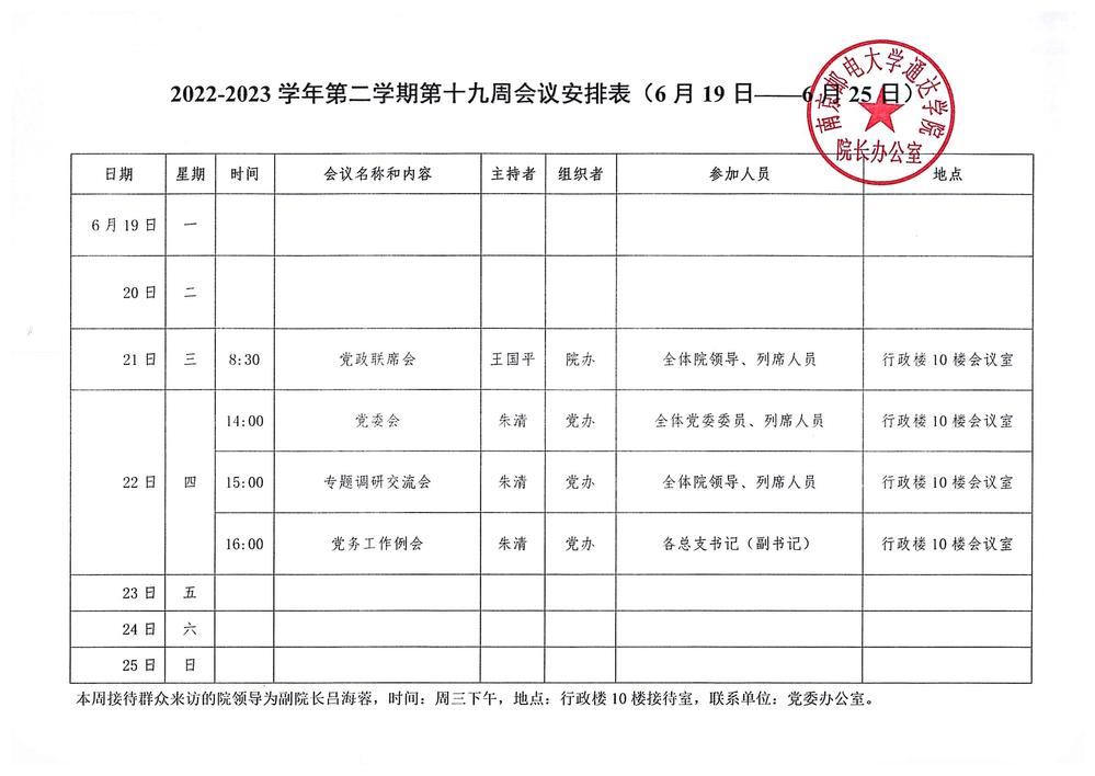 2022-2023学年第二学期第十九周会议安排表
