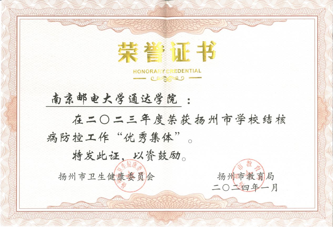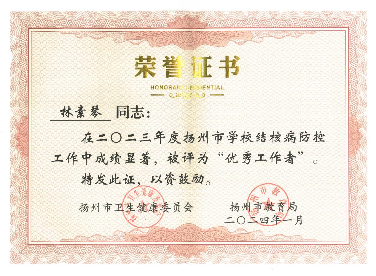近日,扬州市卫生健康委员会、扬州市教育局对2023年度在学校结核病防治工作中做出突出成绩的优秀集体、优秀工作者予以表彰。kaiyun体育网页登录入口被评为优秀集体,后勤管理处林素琴荣获扬州市2023年度学校结核病防治工作“优秀工作者”。