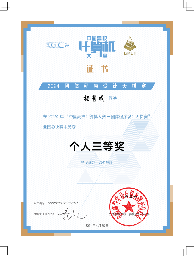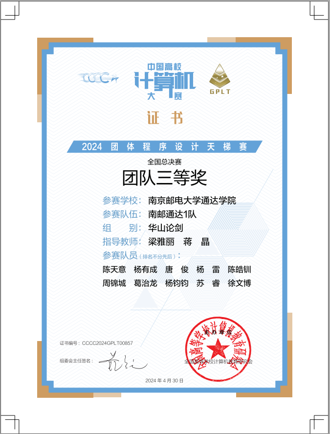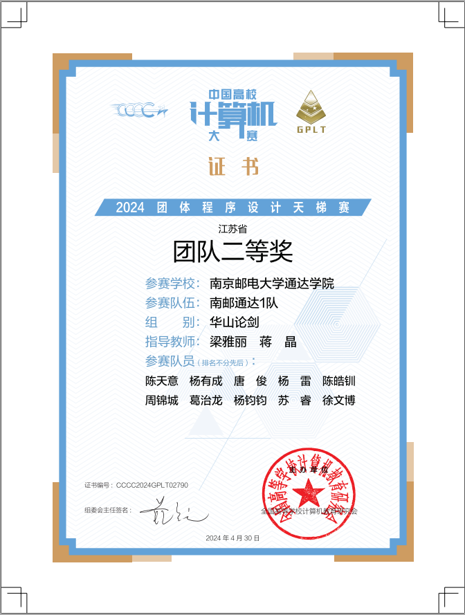 近日,由全国高等院校计算机教育研究会主办的“第九届中国高校计算机大赛-团体程序设计天梯赛”获奖名单正式公布,kaiyun官网两支代表队在3小时的比赛中,争分夺秒,团队协作,顽强拼搏,喜获全国总决赛团队三等奖、江苏省团队二等奖各1项,其中陈天意获全国个人一等奖、杨有成获全国个人三等奖,创造了学院在该项赛事的新纪录。