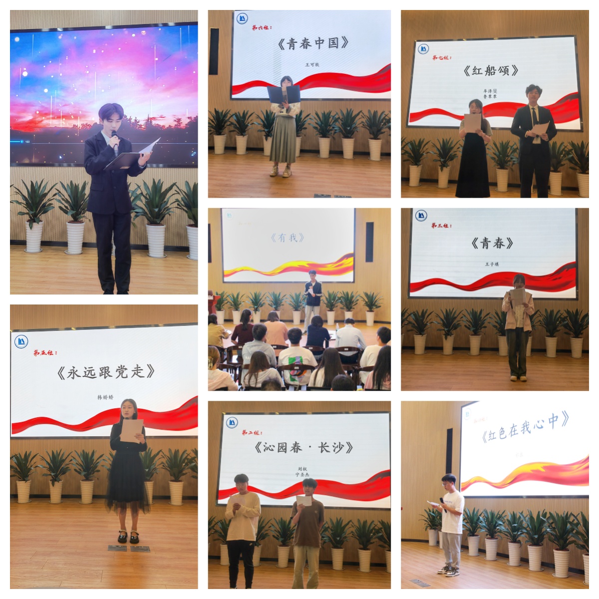 紧接着进行的“踏征程·青年无悔强国志”红色诗歌诵读比赛将读书会推向了高潮。八组参赛选手身着正装,精神饱满,分别登台诵读了《沁园春·长沙》《红色在我心中》《永远跟党走》《青春中国》《红船颂》《不朽》等脍炙人口的红色诗歌。每一篇经典诗歌都蕴含着丰富的革命精神和红色文化,每一句诵读都饱含着对党的深情厚意和对祖国的无限热爱。在诵读过程中,同学们不仅展现了出色的朗诵技巧,更通过深情演绎,将红色经典中的革命精神传递给在场的每一个人。经过激烈的角逐,最终比赛评选出一等奖两名,二等奖两名及三等奖四名。