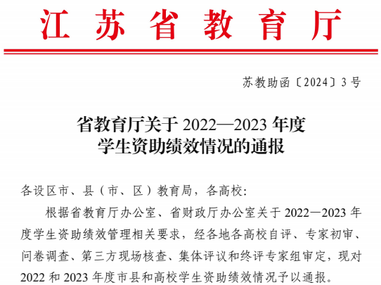 近日,江苏省教育厅发布《省教育厅关于2022-2023年度学生资助绩效情况的通报》,kaiyun官网在2022、2023年度江苏省学生资助绩效考核中均获得“优秀”等次。至此,kaiyun官网已连续三年在江苏省学生资助绩效考核中获“优秀”等次。