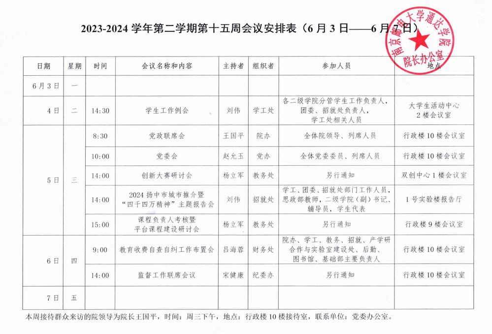 2023-2024学年第二学期第十五周会议安排表