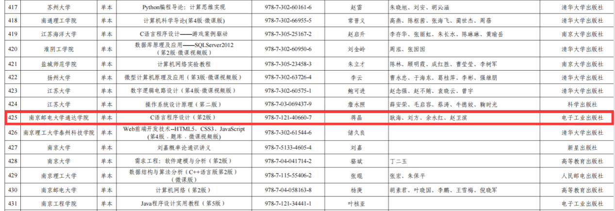 近日,省教育厅公布了江苏“十四五”普通高等教育本科省级规划教材名单,kaiyun官网推荐申报的《C语言程序设计(第2版)》成功入选。