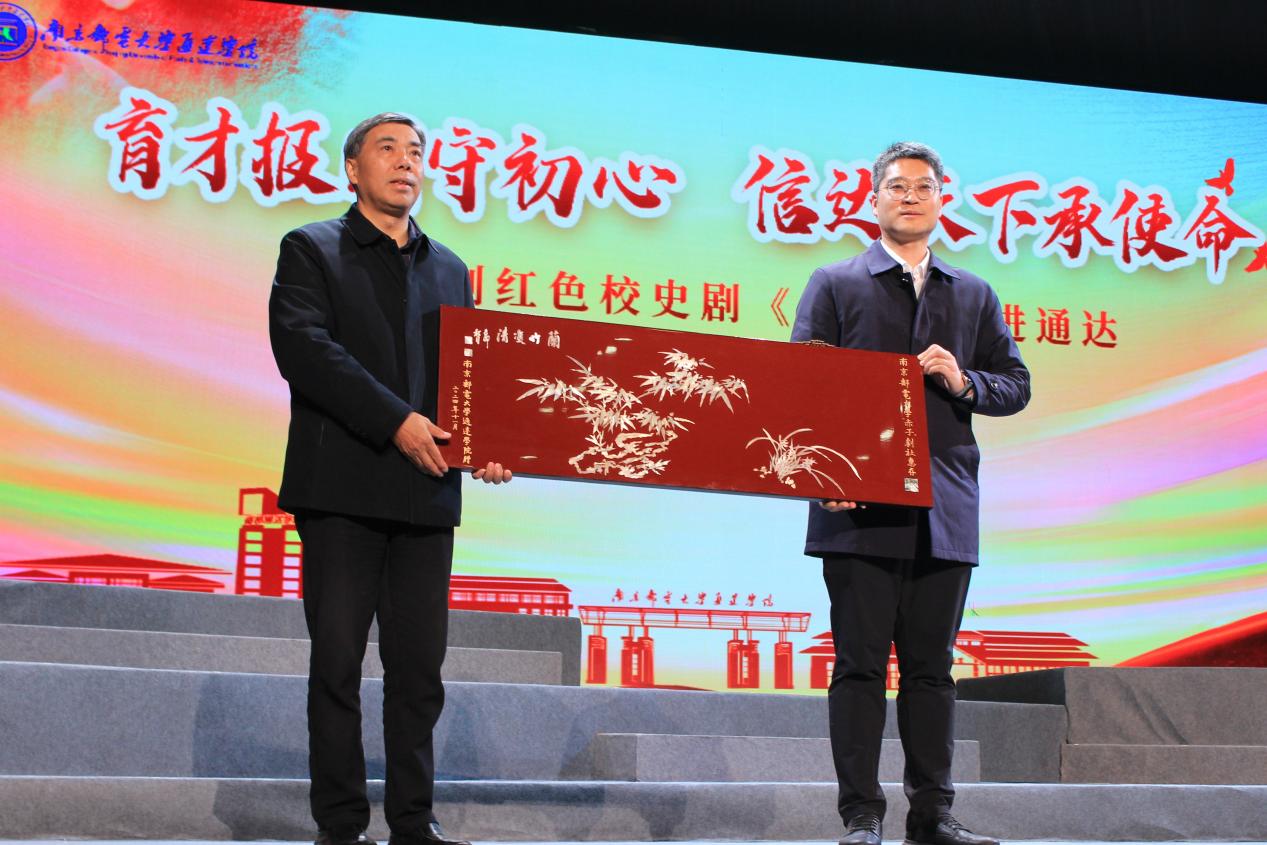 kaiyun体育网页登录入口院长王国平代表学院向本次演出的kaiyun体育网页登录入口《赤子》剧社赠送牌匾,表达了对他们的感谢之情。