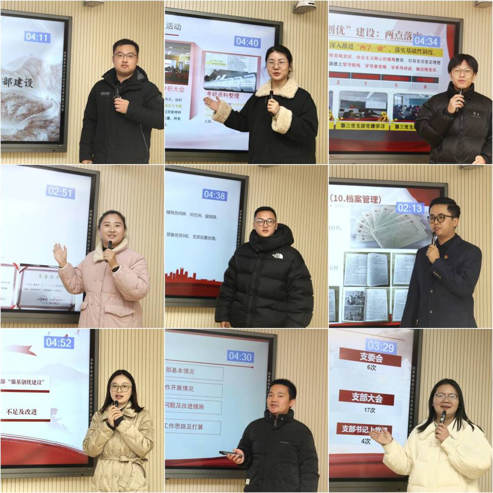 会上,来自教工党支部的6位书记与学生党支部的9位书记依次“登台亮相”,详细汇报了2024年度基层党建工作的实施进展与成效。他们紧扣党的二十届三中全会精神主线,交流展示了党支部在强化政治引领和组织建设上的创新举措和特色做法,教工党支部书记们强调了通过定期开展政治学习、组织生活会等形式,增强党员的政治意识、大局意识、核心意识、看齐意识。学生党支部书记们重点阐述了通过主题党日、志愿服务等活动,如何有效提升学生党员的党性觉悟和实践能力。此外,各党支部书记还介绍了推进党建和业务工作融合发展的具体举措。同时,各党支部深入剖析了工作中的短板及成因,提出了针对性的改进措施,为2025年的工作明确了方向和思路。
