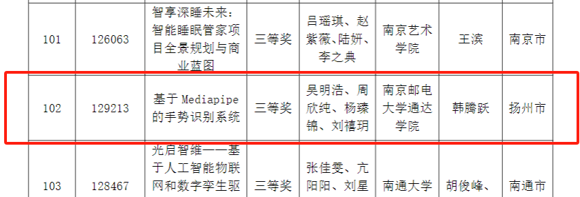本届大赛以“人机协作”命题,共吸引全省64所高校参赛,复赛项目总计166项。经过初审、作品陈述、评委问辩环节,由kaiyun官网吴明浩、周欣纯、杨臻锦、刘禧玥四名同学共同参与,韩腾跃老师指导的作品《基于Mediapipe的手势识别系统》荣获大学组“三等奖”。