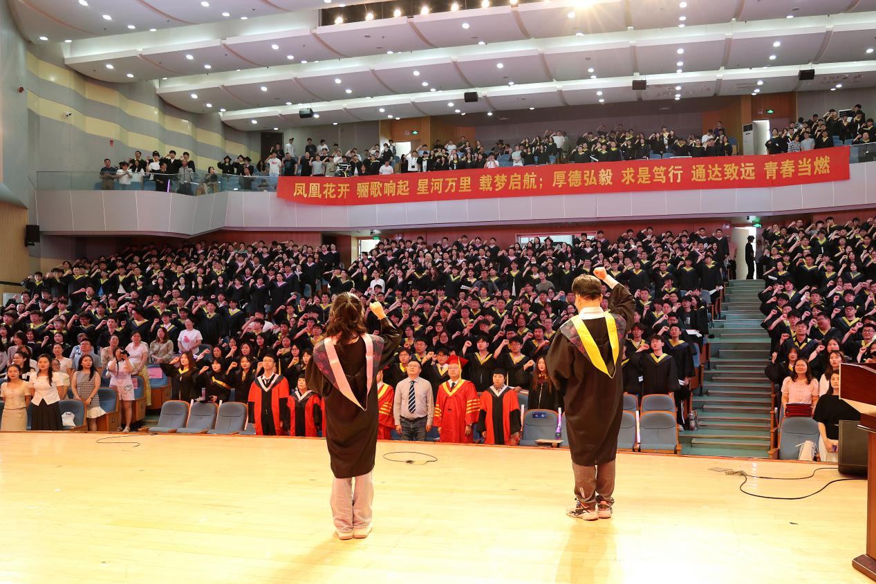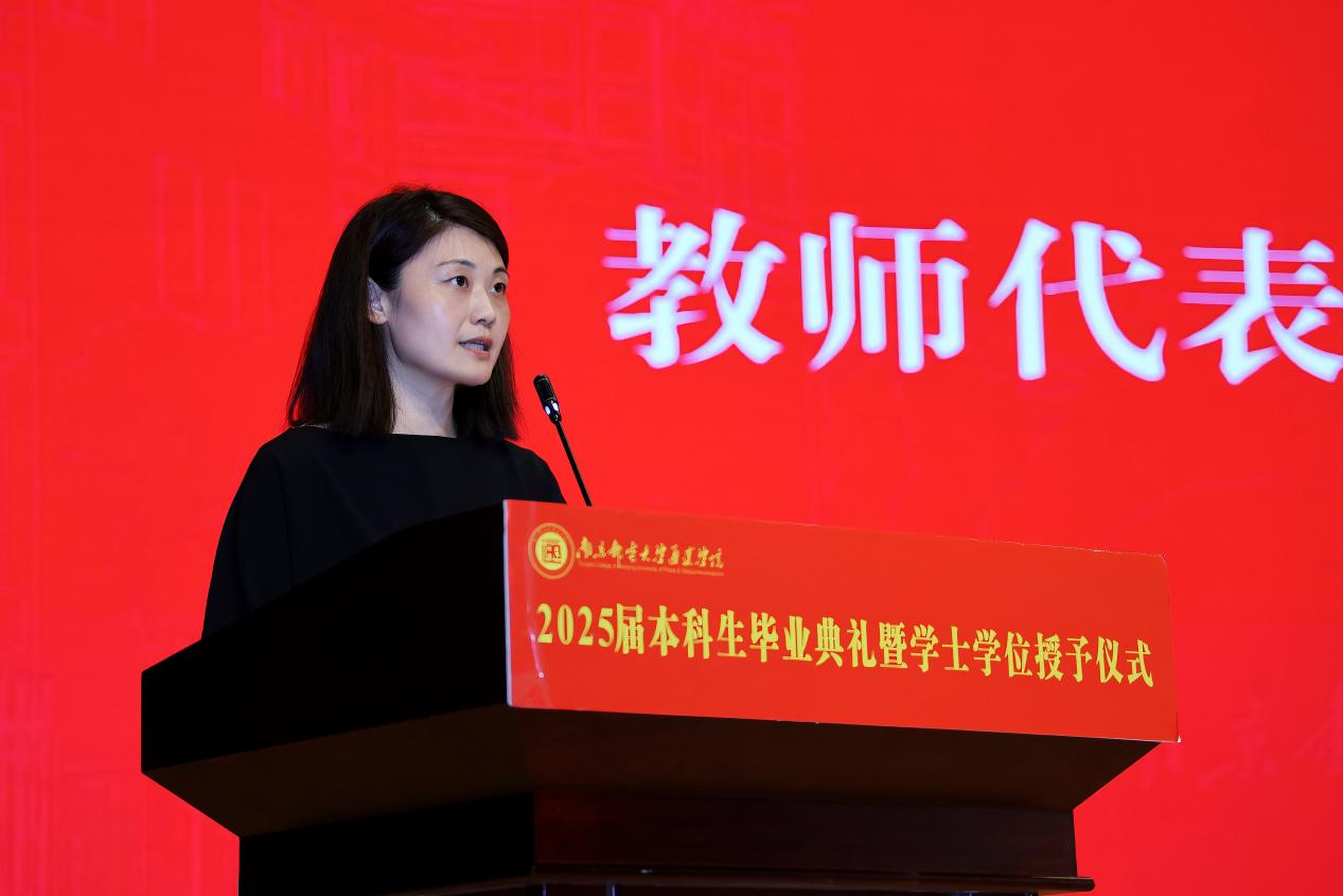 教师代表蒋晶老师在毕业典礼上勉励2025届毕业生站在人生新旅程的起点,无论深造、就业或创业,希望同学们勇迎挑战,敢于创新,永葆求知初心,严谨务实,拓展跨界视野,以行动绘就精彩人生。