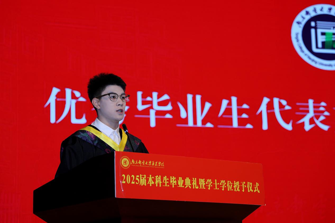 优秀毕业生代表,通信工程学院通信工程专业方思捷同学回顾了在通达求学的时光,感恩母校、师长、同窗的陪伴与付出。他表示毕业是新起点,将秉持南邮精神,脚踏实地、勇毅前行,用行动续写辉煌。
