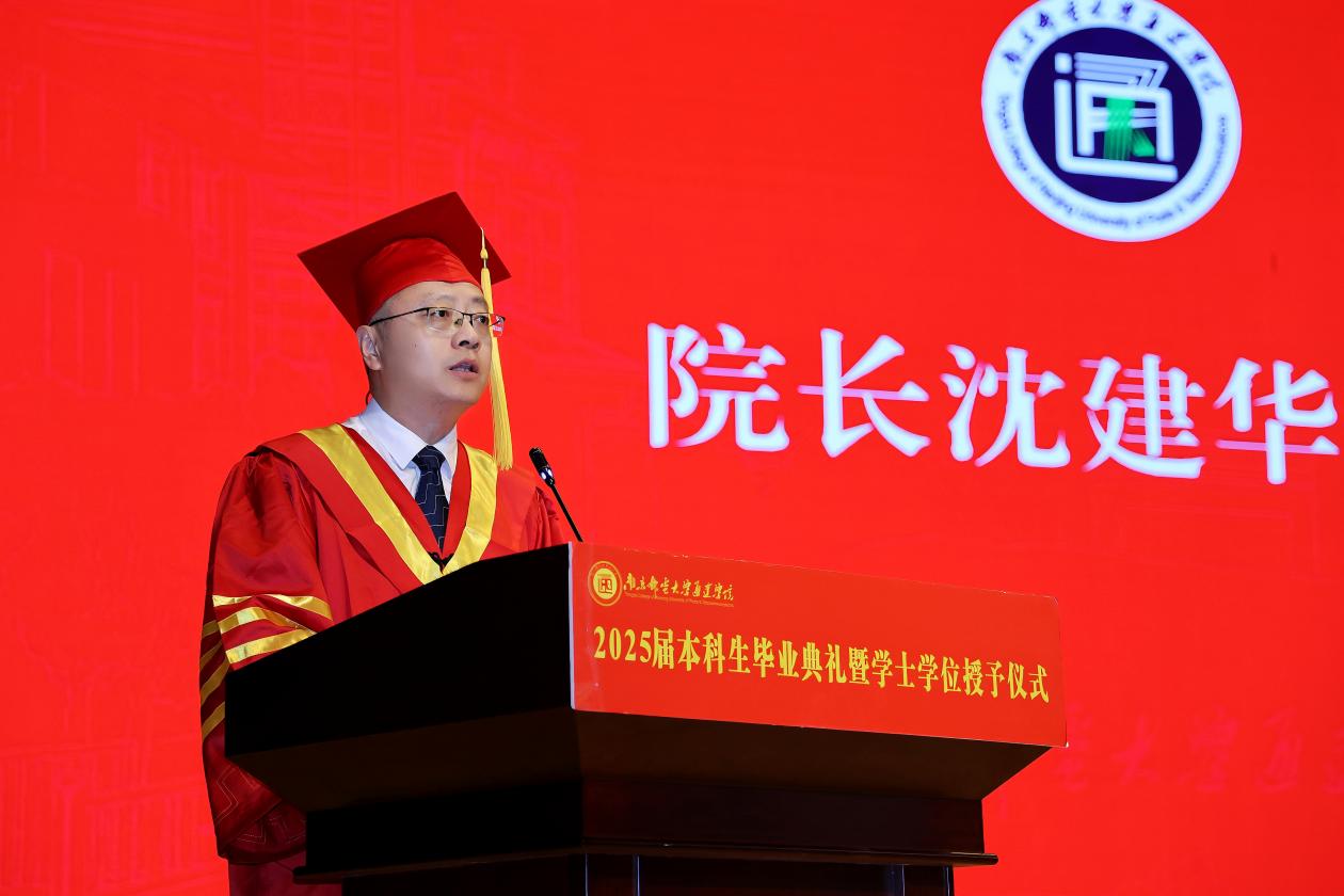 沈建华院长代表学院向圆满完成学业的毕业生致以热烈祝贺,向在同学们成长路上付出辛勤汗水的教职员工、家长及社会各界表达衷心感谢。他在讲话中回顾了毕业生们在校期间的点点滴滴,肯定了他们在学业、竞赛实践、创新创业等方面的优异成绩,赞扬了他们勇于担当、敢于创新的精神风貌。他勉励大家在人工智能等新技术蓬勃发展的时代,以勤学为伴,保持终身学习的态度,将终身学习融入信仰、责任与生活,让勤学善思成为青春最鲜明的底色;以乐观为底,勇于在时代浪潮中破浪前行,用知足之心守初心,用热爱之眼望征途,用简净之态破迷障,让乐观成为生命最坚韧的底色;以感恩为光,在德行路上筑梦前行,常念他人之助,常思所得之幸,常修立身之德,常守行事之正,让感恩成为成长最醇厚的底色。