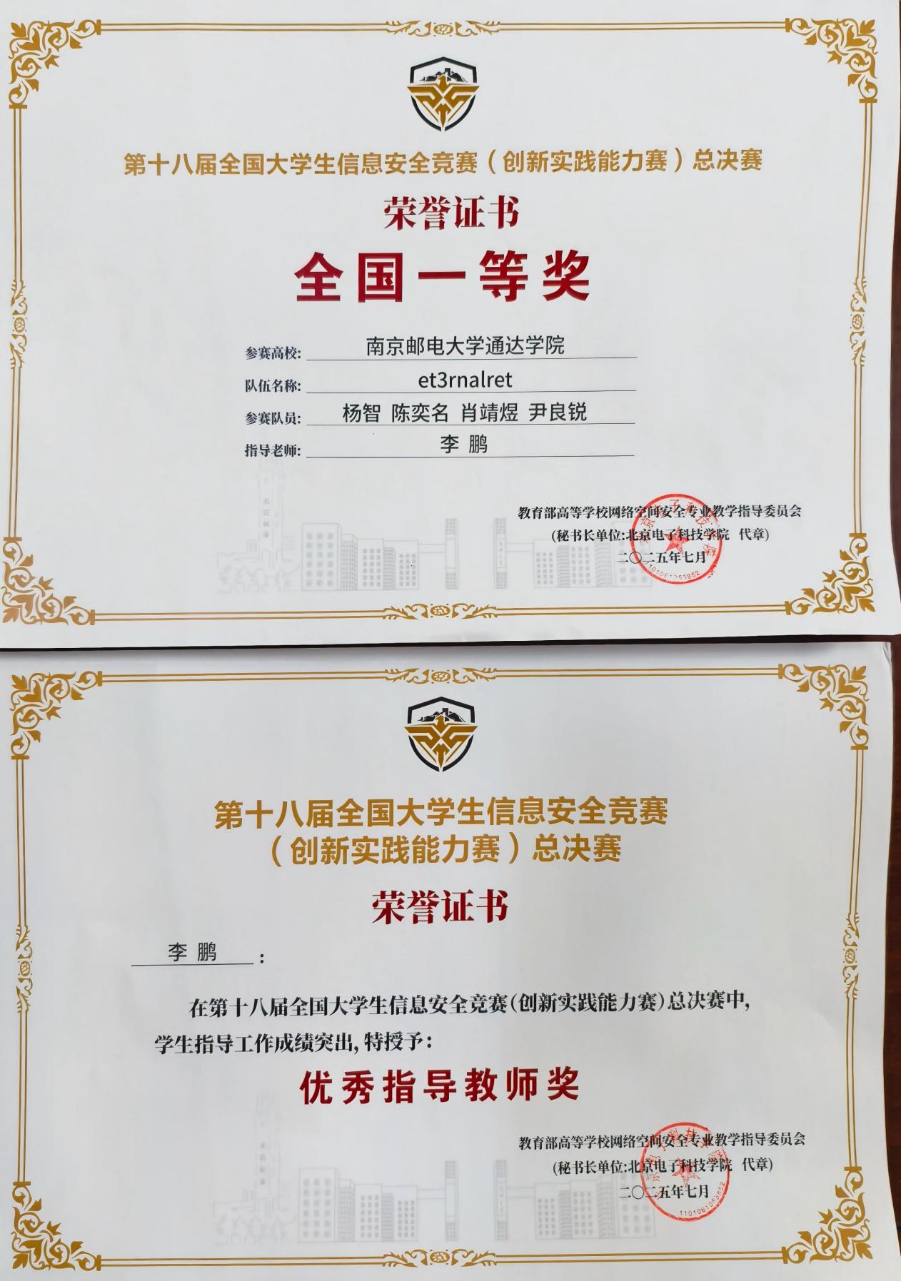 全国一等奖荣誉证书、优秀指导教师荣誉证书