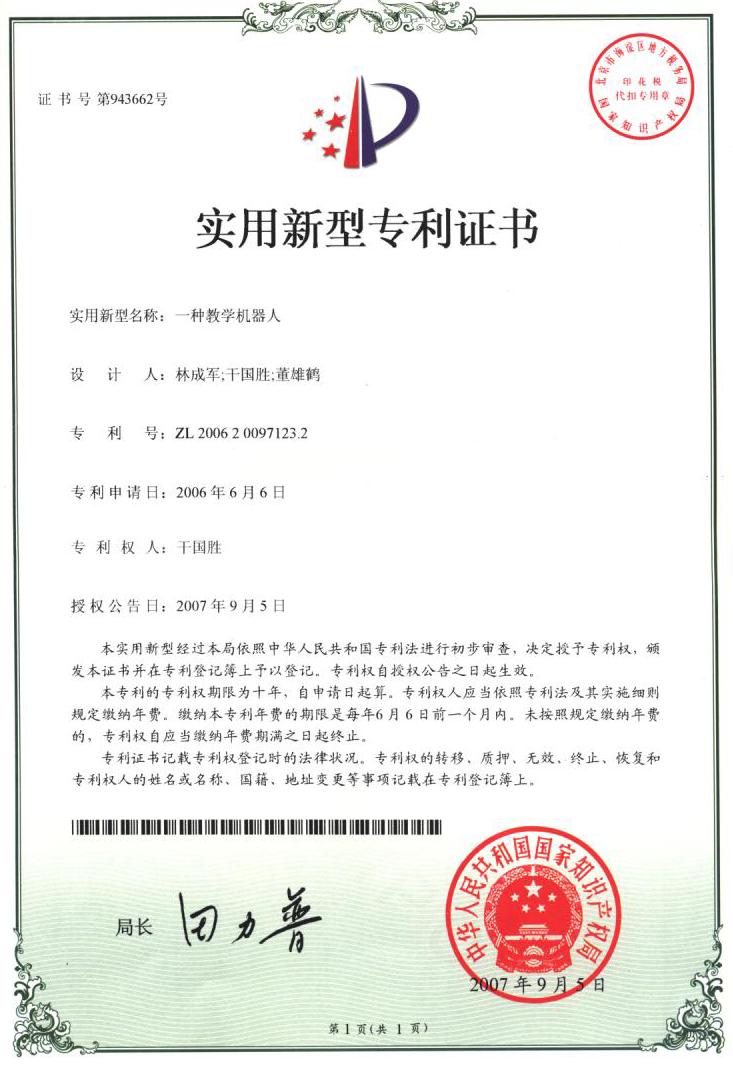 本网讯 (记者 鱼昆 报道)95日,国家知识产权局正式授权公告,授予我院计算机工程系副主任干国胜副教授研制的“一种教学机器人”专利权,并颁发了实用新型专利证书。