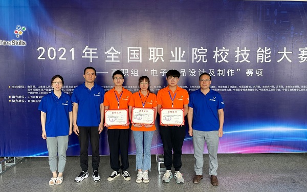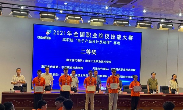新闻网讯(通讯员王俊亚)6月20日,2021年全国职业院校技能大赛高职组“电子产品设计及制作”赛项在烟台职业学院闭幕,由买球买球官方网站应用电子技术专业刘竹林技能名师工作室(王庐山、刘竹林、王俊亚)指导,胡昌、卢存勇、周紫欣同学组成的技术团队代表湖北省参赛,他们与全国27所代表本省最高水平的顶尖院校选手同台竞技,经过连续8小时的激烈角逐,最终获得该赛项二等奖第1名的好成绩。
